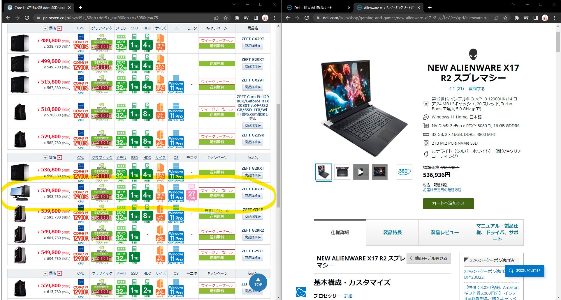 ALIENWARE x17 R1は既に販売終了していますので、 現行モデルだとALIENWARE x17 R2になります。